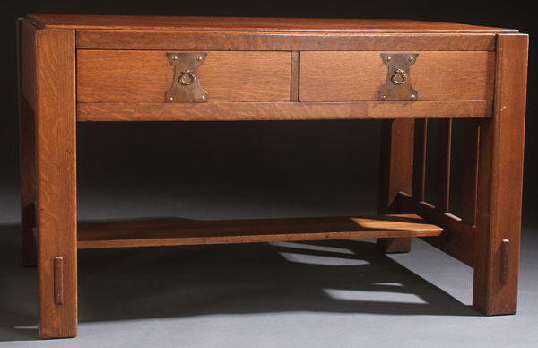 AN IMPERIAL ARTS AND CRAFTS LIBRARY TABLE, CIRCA 1905. Two drawers, with slatted sides and broad lower shelf. Width 49 inches, depth 32 inches, height 30 inches (124.5 x 81.3 x 76.2 cm).