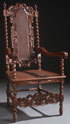 A JACOBEAN STYLE CARVED WOOD ARMCHAIR, 20TH CENTURY. With acanthus and "C" scroll carved openwork back supported by barley twist columns containing woven seat and back panel. Height 51.5 inches (131 cm), width 24.25 inches (61.5 cm), depth 22 inches (56 cm).