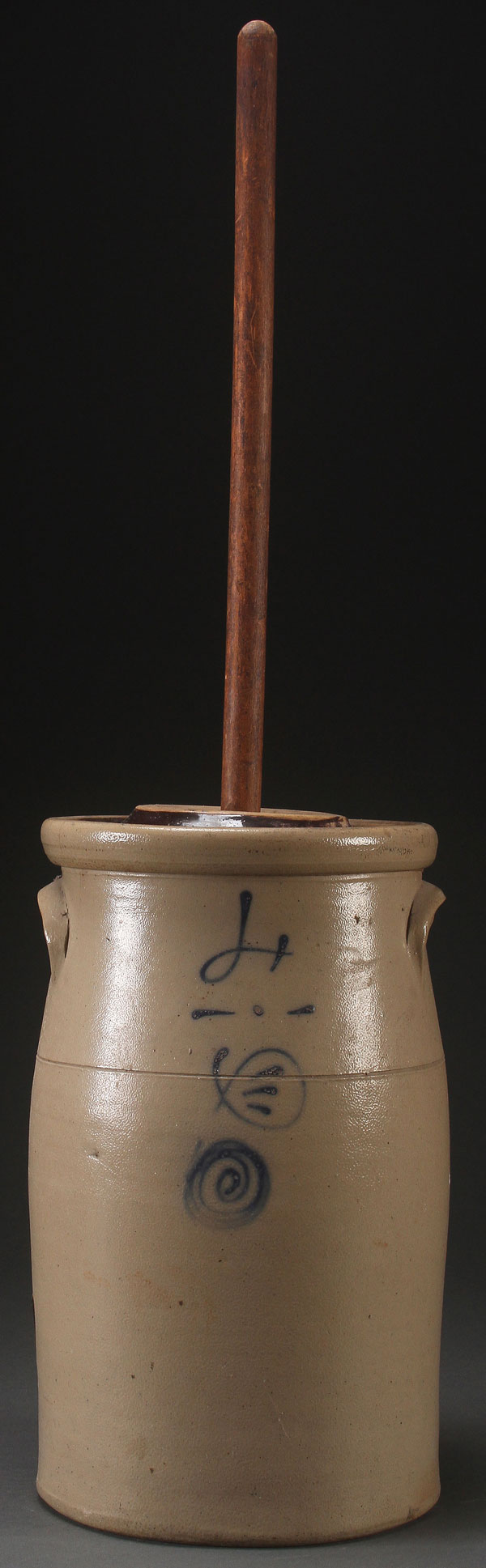 A FOUR GALLON SALT GLAZE STONEWARE CHURN, LATE 19TH CENTURY. With cobalt decorated leaf and target below a numeral 4, applied ear handles, later Albany slip lid and wood handled dasher. Stoneware height 15.5 inches (39 cm), total height 34 inches (86.5 cm).