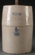 A THREE GALLON FORT DODGE, IOWA PLYMOUTH STONEWARE CHURN, CIRCA 1900. With later Albany slip lid and wood dasher, some chips. Stoneware height 14.25 inches (36 cm), total height with dasher 42.75 inches (108.5 cm).