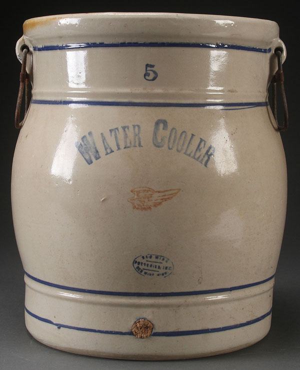 A FIVE GALLON REDWING STONEWARE WATERCOOLER, EARLY 20TH CENTURY. With small wing and oval Potteries label, bail handles complete, lid and spigot absent. Height 14.5 inches (37 cm).