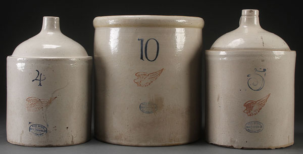 A REDWING STONEWARE CROCK AND JUGS, EARLY 20TH CENTURY. Comprising a 10 gal. crock, a 4 and 5 gal. (with crack) jug, all with Union oval labels. The largest 17.75 inches (45 cm).