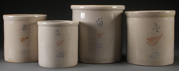 FOUR REDWING STONEWARE CROCKS, EARLY 20TH CENTURY. Comprising a 2, 3, 4 (cracked), and 5 gallon with Union or Potteries oval label. The largest 13.25 inches (33.5 cm).