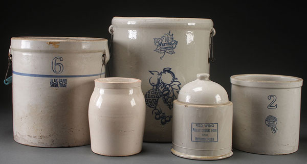 A FIVE PIECE MIDWEST STONEWARE GROUP, 20TH CENTURY. Comprising a 6 gal. blue band, an unmarked 1 gal. jar, a 10 gal. Western, a Redwing feeder (base absent), and 2 gal. Buckeye. The largest 17.75 inches (44 cm).
