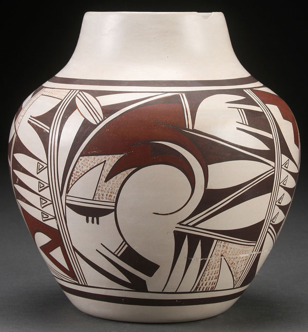 A FROG WOMAN HOPI POLYCHROME POTTERY VASE. Some loss. Frog mark on base. Height 7.25 inches (18.3 cm).