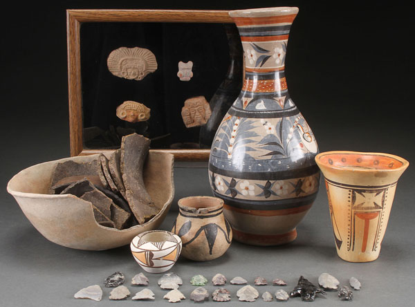 A SOUTHWEST NATIVE AMERICAN POTTERY GROUP. Comprising both ancient and contemporary pieces, including an Acoma cabinet vase, a Hopi polychrome tumbler, various remnants and shards, a group of arrowheads, and other items including a Mexican vase, and Colima fragments. The largest 12.5 inches (32 cm).