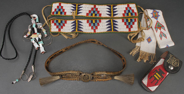 A NATIVE AMERICAN DECORATIVE ARTS GROUP, EARLY TO MID-20TH CENTURY. Comprising a very fine woven horse hair hat band, a pair of beaded deer skin arm bands, an Arapaho beaded strip, an inlayed silver hoop dance figure bolo, and a beaded knife case.