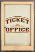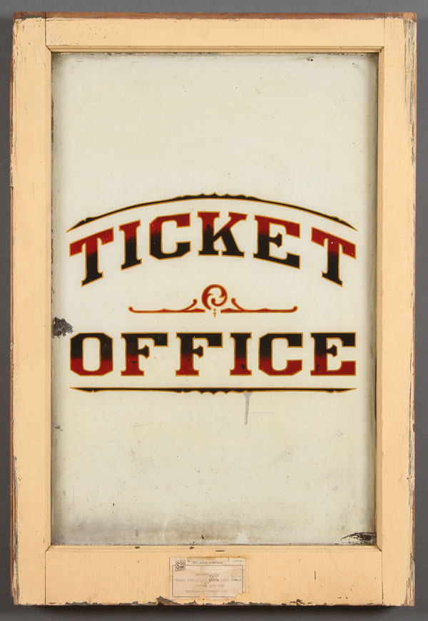 A DEPOT TICKET WINDOW. Wood framed and reverse painted window “Ticket Office” in red and black on cream ground for a double hung window frame. Soo Line placard with hours attached. 24 inches x 35 inches.
