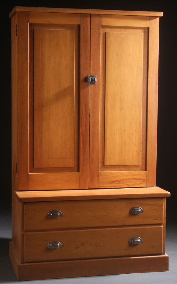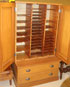 A ROCK ISLAND RAILROAD LINES PINE TIMETABLE AND FORMS STORAGE CABINET, EARLY 20TH CENTURY. The interior with a multitude of divided 10 inch x 12 inch storage trays, the majority retaining original I.D. tags for various routes, raised on an extending two drawer base. Height 60.5 inches (154 cm), width 34 inches (89 cm), depth 21.5 inches (54.5 cm).