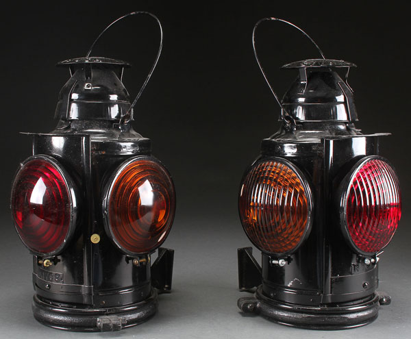 A PAIR OF N.Y.C.S. RAILROAD CAR MARKER LAMPS, 20TH CENTURY. Each with amber and red lenses. By Handlan. Height excluding handles 14.5 inches (37 cm).