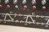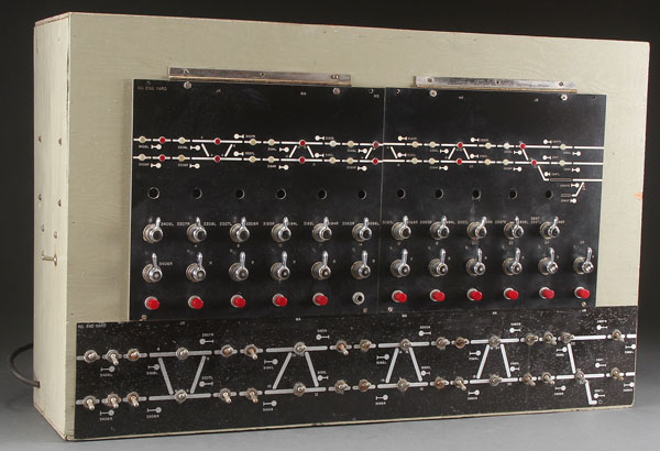 A RAILROAD SWITCH CONTROL BOARD. Contained in a wood case with nickle plate thumb switches and lighted positions. Length 32 inches.