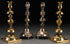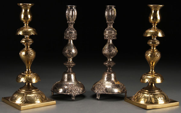 TWO PAIRS OF WARSAW JUDAICA CANDLESTICKS, 19TH CENTURY. With embossed gilt metal frame supporting a copper luster beaded pouch with green, amethyst, and gold highlights terminating with an elongated loop fringe. Apparently unmarked. Length 11.5 inches (29 cm).