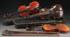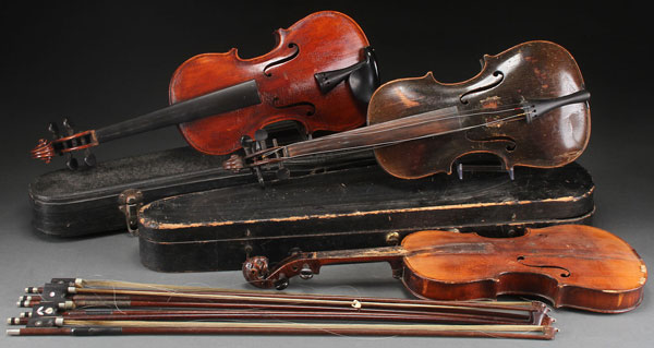 THREE VINTAGE VIOLINS, LATE 19TH EARLY 20TH CENTURY. Including one with a carved lion's head peg box terminal, together with six bows with mother of pearl inlay, one stamped "Tour le Model," in various condition and includes two cases, one wooden coffin style. The largest 29 inches (73.5 cm).
