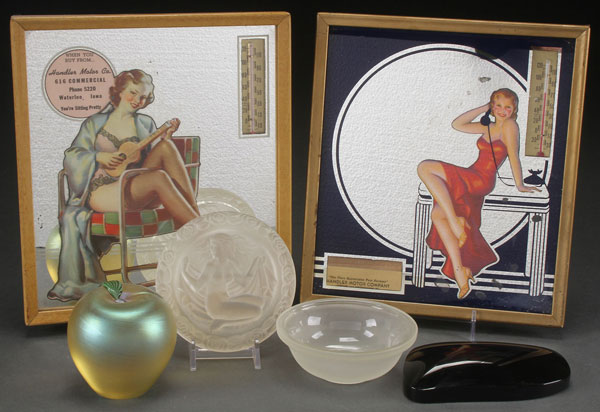 AN ART DECO DECORATIVE GROUP, 1ST HALF OF 20TH CENTURY. Comprising two mirrored advertising thermometers, a frosted and molded glass covered powder box - probably French, a free form black glass paperweight, and an Orient and Flume iridized apple form weight (loss to stem).