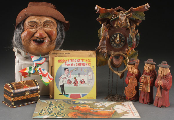 A MID-CENTURY NOVELTY AND COLLECTABLES GROUP. Comprising a Laffun head drunkard in original box, a carved wood German cuckoo clock, carved wood and polychrome musician figures, a parquetry dresser box, and other items. The largest 9 inches (23 cm).