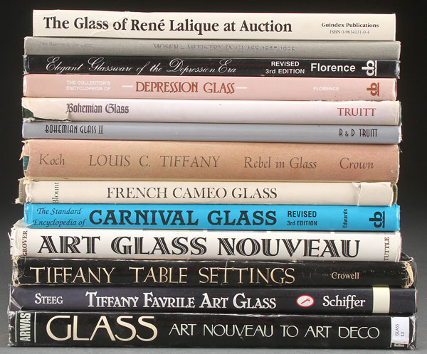 A THIRTEEN PIECE GROUP OF GLASSWARE REFERENCE BOOKS. Including "Glass, Art Nouveau to Art Deco" by Victor Arwas, "Louis C. Tiffany, Rebel in Glass" by Robert Koch, "French Cameo Glass" by Bernice and Henry Blount, "Art Glass Nouveau" by Ray & Lee Grover, and other art glass books.