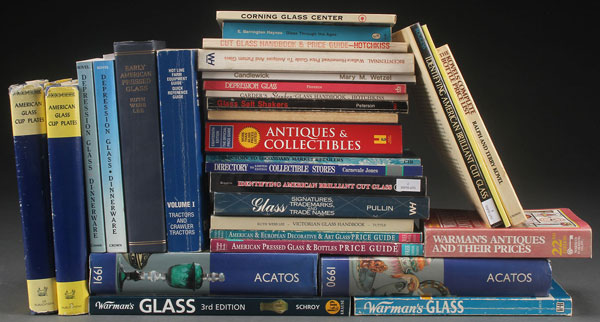 A THIRY-ONE PIECE GROUP OF PRESSED AND DEPRESSION GLASS BOOKS. Including "American Glass Cup Plates" by Ruth Webb Lee and James H. Rose, "Early American Pressed Glass" by Ruth Webb Lee, "Acatos 1990, Ceramics and Glass International Auction Records," auction directories, and other various glassware books.