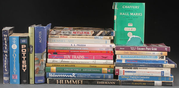 A LARGE GROUP OF ANTIQUE AND COLLECTABLES REFERENCE GUIDES. Including "Silver Flatware, English, Irish, and Scottish 1660-1980" by Ian Pickford, "American Belleek" by Mary Frank Gaston, "Hummel: The Complete Collector's Guide and Illustrated Reference" by Ehrmann, "Huxford's Collectible Advertising, Fourth Edition," and several other reference books on antique jewelry, porcelain, china, and others.