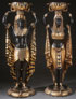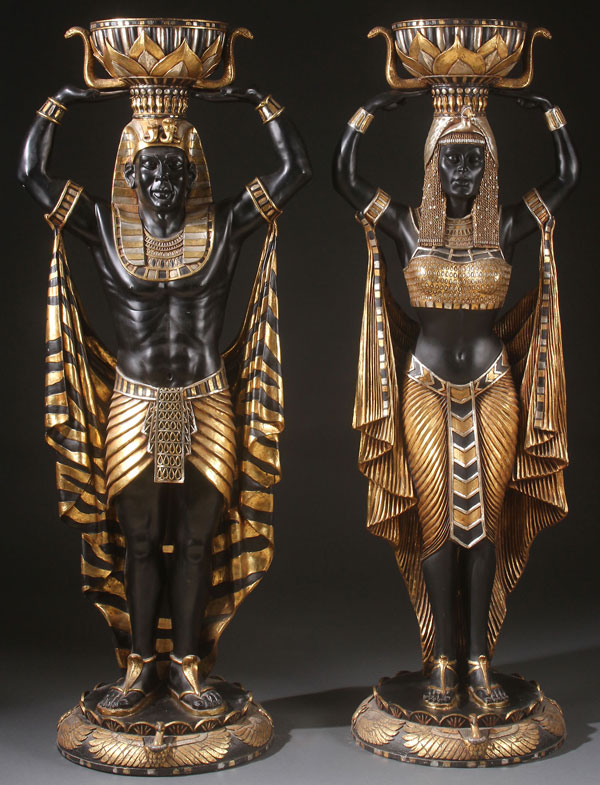 A PAIR OF EGYPTIAN REVIVAL LIFE-SIZE FIGURAL TORCHERES. In the form of royal attendants bearing urns. Ebonized and gilt cast resin. Height 73 inches (185.42 cm).