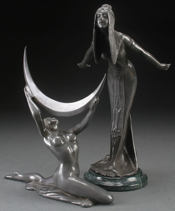 A PAIR OF ART DECO STYLE FIGURES, CONTEMPORARAY CAST METAL. With pewter finish, one on marble base. The largest 13.75 inches (35 cm).