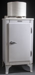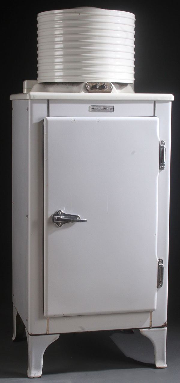 A VERY FINE G.E. MONITOR TOP REFRIDGERATOR, CIRCA 1934. Model CA-1-A16, appears to be running. Height 61 inches (155 cm), 24 inches square (61 cm).