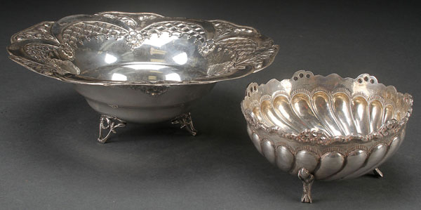 A PAIR OF CONTINENTAL SILVER BOWLS, CIRCA 1900. The largest with wide flared scalloped rim decorated in repoussé with oak leaf and acorns and alternating reticulated lattice panels, raised on three scrolled bracket feet, and twist ribbed fingerbowl raised on paw feet, each stamped "925" and "800" respectively. The largest 9 inches diameter (23 cm). Total weight 10.16 troy ounces.