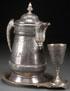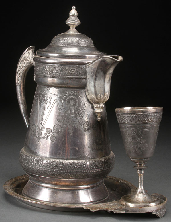 A VICTORIAN THREE PIECE ICE WATER SET. In quadruple plate, by Hall, Elton, & Co. comprising a porcelain lined pitcher, underplate, and matching goblet. Height 14.25 inches (36 cm).